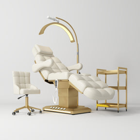 Transform your salon into a haven of luxury and efficiency with the Manufakturo Orielle B Creamy – 4-Piece Beauty Studio Set. This exquisite collection is designed to meet the sophisticated needs of beauty professionals, combining elegance with functionality. At the heart of this set is the Manufakturo Orielle Electric Beauty Bed, which redefines comfort with its high-density memory foam and luxurious faux leather upholstery. The bed's three-plane adjustable system, powered by three electric motors, ensures effortless positioning and maximum client relaxation during treatments. Paired with this is the Manufakturo Noblesse Beauty Chair, a masterpiece of modern design that offers both style and support. Its high-performance faux leather covering and golden chrome base make it a stunning addition to any space, while its versatile adjustments cater to your every need.