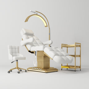 Transform your salon into a haven of luxury and efficiency with the Manufakturo Orielle B White – 4-Piece Beauty Studio Set. This exquisite collection is designed to meet the sophisticated needs of beauty professionals, combining elegance with functionality. At the heart of this set is the Manufakturo Orielle Electric Beauty Bed, which redefines comfort with its high-density memory foam and luxurious faux leather upholstery. The bed's three-plane adjustable system, powered by three electric motors, ensures effortless positioning and maximum client relaxation during treatments. Paired with this is the Manufakturo Noblesse Beauty Chair, a masterpiece of modern design that offers both style and support. Its high-performance faux leather covering and golden chrome base make it a stunning addition to any space, while its versatile adjustments cater to your every need.
