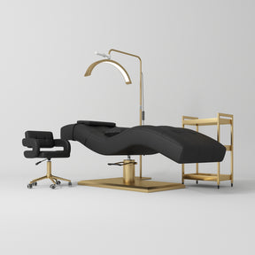 The Manufakturo Prestige Complete Studio Set is your ultimate solution for a luxurious and professional salon experience. This set features a carefully curated selection of premium equipment, including a lash bed, salon chair, beauty trolley, and LED moonlight, each designed to enhance the efficiency and comfort of your beauty treatments. The Manufakturo Prestige Lash Bed, with its titanium gold stainless steel base and cross structure, offers unparalleled stability and elegance. Its multi-layered solid wood frame, adorned with easy-to-clean synthetic leather, ensures both aesthetic beauty and practicality. The segmented bed surface supports the body's natural contours, while the adjustable headrest and pump-operated lift function provide tailored comfort and ease for a variety of treatments.