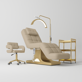 The bed's premium comfort with high-density memory foam and synthetic leather provides unrivalled relaxation, while the salon chair, with its 360-degree rotation and elegant leather upholstery, offers both style and ergonomic support. The LED Moonlight lamp, with its adjustable colour temperature and brightness, ensures perfect lighting for every task, enhancing both aesthetics and functionality. Finally, the stylish beauty trolley with its three-tier storage and 360° swivel casters brings impeccable organisation and mobility to your workspace. Together, these elements create an environment where your professionalism and care shine through, making every client feel pampered and valued.