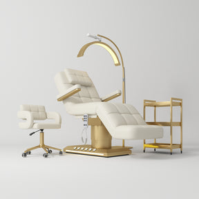 The beauty bed, featuring high-density memory foam and synthetic leather, offers unparalleled comfort and support, while the salon chair’s 360-degree rotation and luxurious leather fabric ensure both elegance and ergonomic ease. The LED Moonlight lamp provides precise lighting with adjustable colour temperature and brightness, making it perfect for any task. Meanwhile, the beauty trolley, with its three-tier storage and 360° swivel casters, enhances your organisational efficiency and mobility. Together, these pieces create a cohesive and stylish workspace where you can focus on what truly matters – your client's satisfaction and comfort.