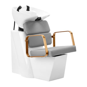 The profiled chair provides adequate lumbar support and, therefore, high comfort of use. Metal armrests in shades of gold with a geometric shape allow for the correct positioning of the customer's shoulders. Filling with durable, deformation-resistant foam and upholstery made of pleasant-to-touch synthetic leather in shades of gray ensure the durability of the furniture, ease of cleaning and comfortable use for a long time. The original, elegant appearance of the hair wash unit gives the interior a unique expression. The set includes complete fittings in shades of black, including a faucet, a shower head and dedicated hoses to provide a complete set of tools for work.