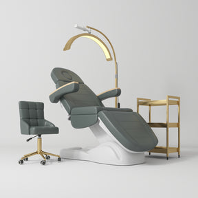 The Manufakturo Grace Electric Beauty Bed is a masterpiece of design and utility, featuring three motors for easy adjustment and a solid wood frame for unbeatable durability. Complementing this is the Noblesse Beauty Chair, which marries Art Deco elegance with modern functionality, offering a comfortable seating experience with a pneumatic lifting system and 360-degree swivel. The Beauty Lash LED Moonlight revolutionises workspace lighting with its adjustable colour temperature and brightness, ensuring every detail is visible and eliminating harsh shadows. Finally, the Beauty Trolley Assistant offers ample storage and mobility, keeping your tools organised and within reach with its three-tier design. Together, this salon set not only meets but exceeds the expectations of busy beauty professionals.