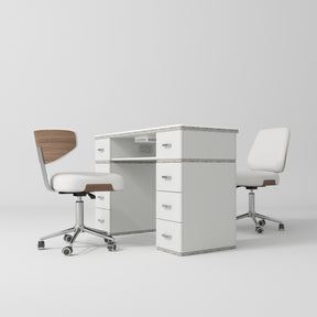 The Manufakturo Manicure Table is engineered for practicality with 8 spacious drawers and an open shelf, ensuring your tools and accessories are always within reach. Made from eco-friendly engineered wood, it promises durability and sustainability, while its high-quality drawer slides and soft-close hinges ensure a smooth and silent operation. The table's comfortable wrist rest and ergonomically designed curved handles reduce fatigue, enhancing the client experience. Accompanying the table are two chairs featuring a robust metal base, curved wood veneer, high-density sponge, and a luxurious leather finish. These chairs provide optimal support and comfort, ensuring a relaxing session for clients.