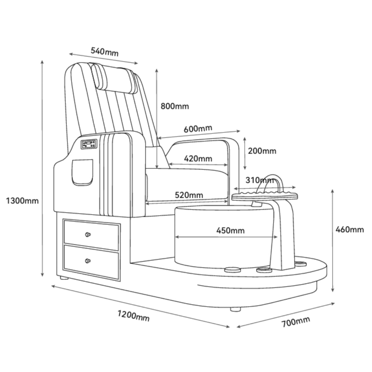 Transform your salon into a haven of elegance and relaxation with the Manufakturo Noémie Luxury Electric Pedicure Chair and matching rolling stool. The pedicure chair, finished with a gold tap, combines beauty and functionality, providing an opulent experience for clients. It features a plush padded seat and a white ceramic basin, designed for ultimate comfort and relaxation. With a robust capacity of 200 kg, it caters to a wide range of clients, making it an essential addition to any modern salon. The integrated massage backrest offers two distinct massage functions, while the electric reclining function allows for effortless adjustment, ensuring each client enjoys a personalised experience. A USB-C socket keeps devices charged, and the magnetic surfing pump with colourful lights adds an engaging visual element to the treatment area.