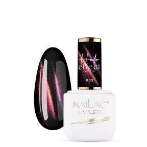 The color of hybrid nail polish 03 from the Cat Eye collection by Nailac is a colorful magnetic hybrid nail polish, Halo Effect. Discover the most sensual companion for black nails. The cat eye you create with the NaiLac magnetic hybrid varnish will shine with metallic particles - from dominant pink to warm orange. Use their multicolored, changing glow in styles with black as the main character.